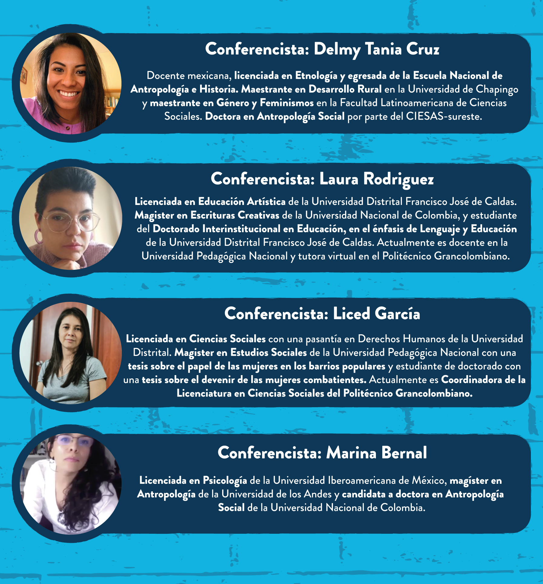 Para esta segunda edición del Encuentro de Saberes estarán presentes reconocidas académicas latinoamericanas, quienes gozan de una experiencia y trayectoria relevante en el campo de las Ciencias Sociales y de la Educación. Además, estarán Laura Rodríguez y Lised García, docentes de la Escuela, quienes aportarán mirada local frente a las discusiones propuestas.