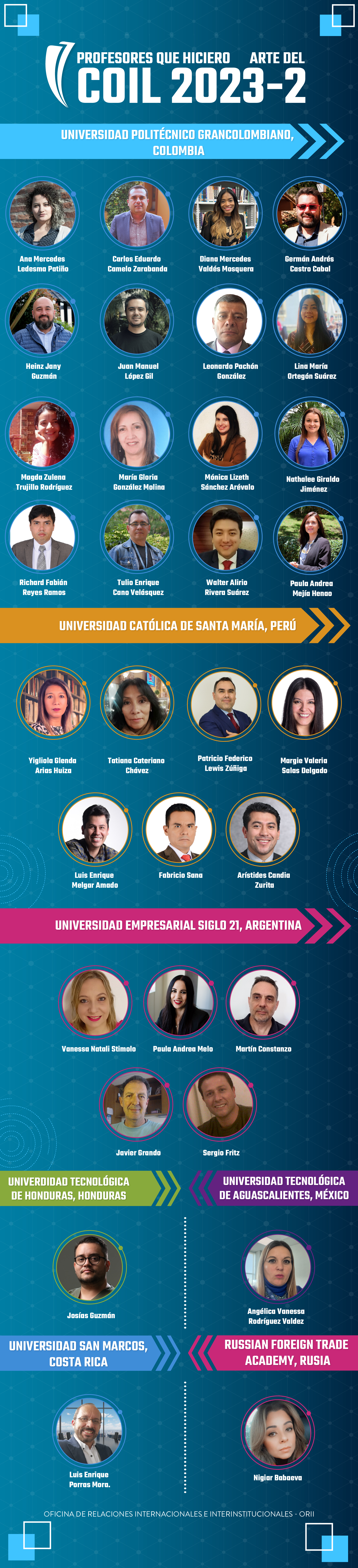 Esta vez, en el Poli tuvimos la oportunidad de trabajar con profesores de la Universidad Católica de Santa María (UCSM) de Perú, de la Universidad Empresarial Siglo 21 (UES21) de Argentina, de la Universidad Tecnológica de Aguascalientes (UTAGS) de México, de la Russian Foreign Trade Academy (RFTA) de Rusia, de la Universidad de San Marcos (USAM) de Costa Rica y de la Universidad Tecnológica de Honduras (UTH).