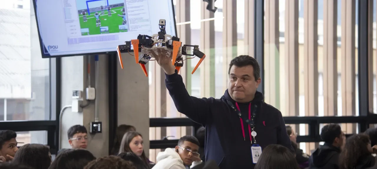 Para finalizar las actividades, se llevó a cabo un diálogo sobre el Taller de Simulación Robótica, en el que Sebastián Rodríguez, docente de ingeniería, estuvo presente y compartió su experiencia. Durante su intervención, explicó lo que se realiza en el Poli en el programa de ingeniería, donde los estudiantes participan en diversos programas.