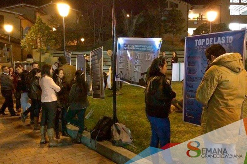 La plazoleta central del bloque J, del Poli, fue el escenario escogido para que los estudiantes de química, pudieran conectar los contenidos de esta asignatura, con su entorno real. Igualmente y como parte de las actividades de la VIII Semana Grancolombiana, se intentó dar a conocer a los asistentes, por medio de posters, cuáles son aquellas sustancias tóxicas que utilizan las industrias más contaminantes, y saber de paso, cuáles son los gases con mayor incidencia en el ‘efecto invernadero’. La actividad se caracterizó por ir dando respuesta a cada una de las preguntas que formularon los asistentes.