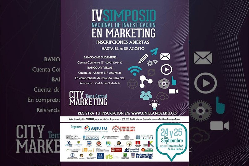 Aspromer, Asociación de programas de Mercadeo, y la Universidad de los Llanos, invitan a todos los interesado en el campo del mercadeo, a participar los próximos 24 y 25 de septiembre en el IV Simposio de Investigación en Marketing. El tema central del evento, que contará con la presencia de invitados nacionales e internacionales, será el City Marketing.