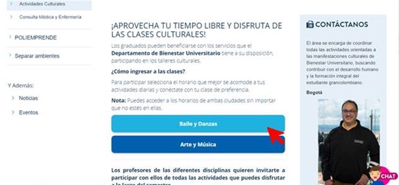 1. Ubica la modalidad en la que quieres participar de las clases de Bienestar, puede ser de forma virtual, o de forma presencial en Bogotá y Medellín: